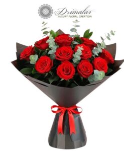 Μπουκέτο με κόκκινα τριαντάφυλλα σε μαύρο περιτύλιγμα για αποστολή λουλουδιών Αθήνα και Πειραιά