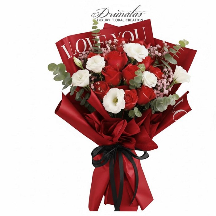 Το μπουκέτο LOVE YOU από το ανθοπωλείο Drimalas Flowers περιλαμβάνει κόκκινα και λευκά τριαντάφυλλα σε πολυτελές μαύρο ή κόκκινο περιτύλιγμα με μήνυμα αγάπης. Προσφέρεται με άμεση αποστολή λουλουδιών σε Αθήνα και Πειραιά και είναι κατάλληλο για ρομαντικά δώρα και ιδιαίτερες περιστάσεις.
